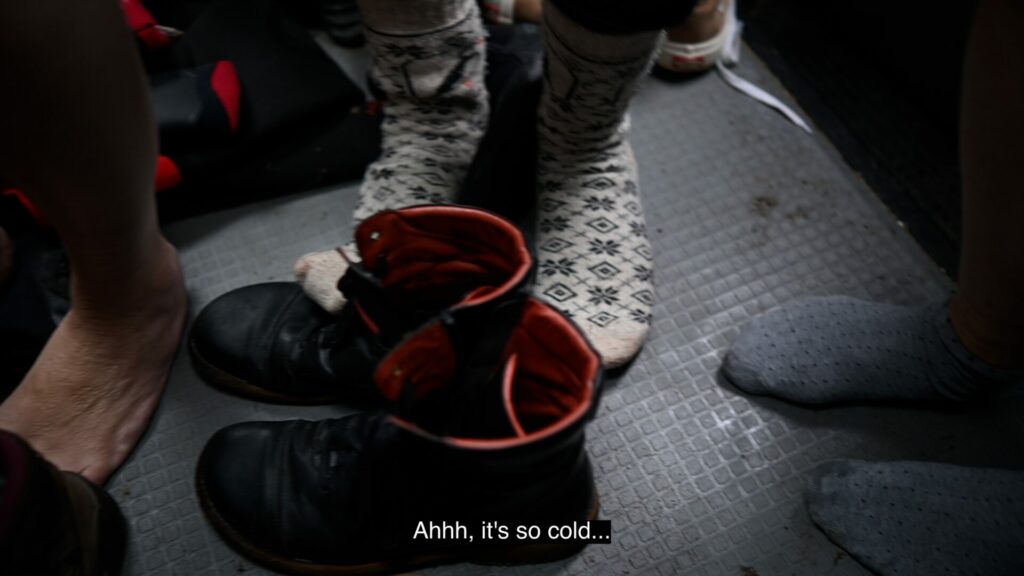 Des serrures gelées aux batteries à plat, Cold Water Sirens raconte en peu de mots, beaucoup de sourires, de fou-rires et de complicité, non pas une session de surf dans des vagues gigantesques, mais plutôt cet entre-deux, entre nuit noire et lever du jour, le prélude, où l’on se prépare, où l’on y croit, où l’on imagine, où l’excitation nous gagne. Moments de partage réconfortants au sein d’une communauté de surfeuses du Danemark. Ou comment faire le plein de chaleur humaine dans un camaïeu de gris.